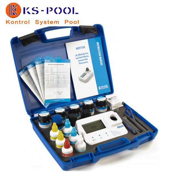 HI971044C se suministra con 2 cubetas de medición con tapa, reactivo líquido para 100 test de Cloro Libre, 100 de Cloro Total, 100 de pH y 10 de Ácido Cianúrico, kit de patrones de calibración certificados, paño limpieza cubetas, tijeras, pilas, instrucciones y maletín de transporte.