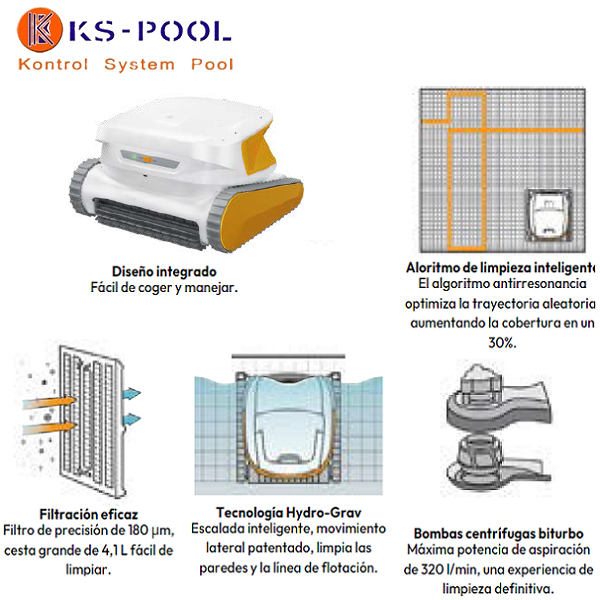 Este robot es compatible con todo tipo de superficies de piscina, incluyendo baldosas, acrílico, fibra de vidrio y plástico.